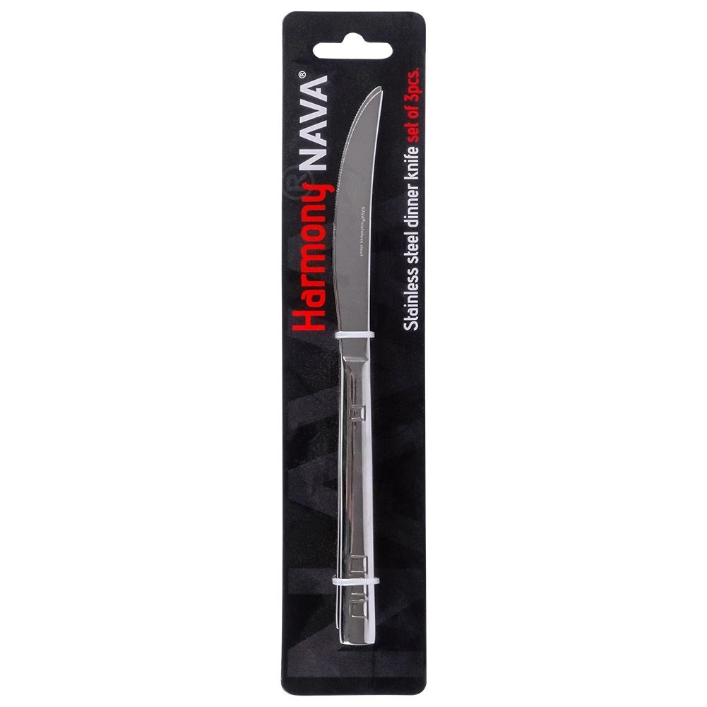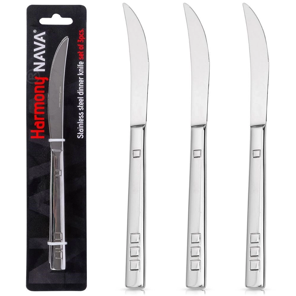 Elegáns, háromdarabos Harmony rozsdamentes késkészlet ezüst kivitelben a mindennapi terítékhez és különleges alkalmakra. A fogazott élnek és a teljesen fém kialakításnak köszönhetően tiszta szeletelést biztosít húsokhoz és más ételekhez is. A polírozott rozsdamentes acél tartós, könnyen tisztítható és mosogatógépben mosható.