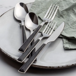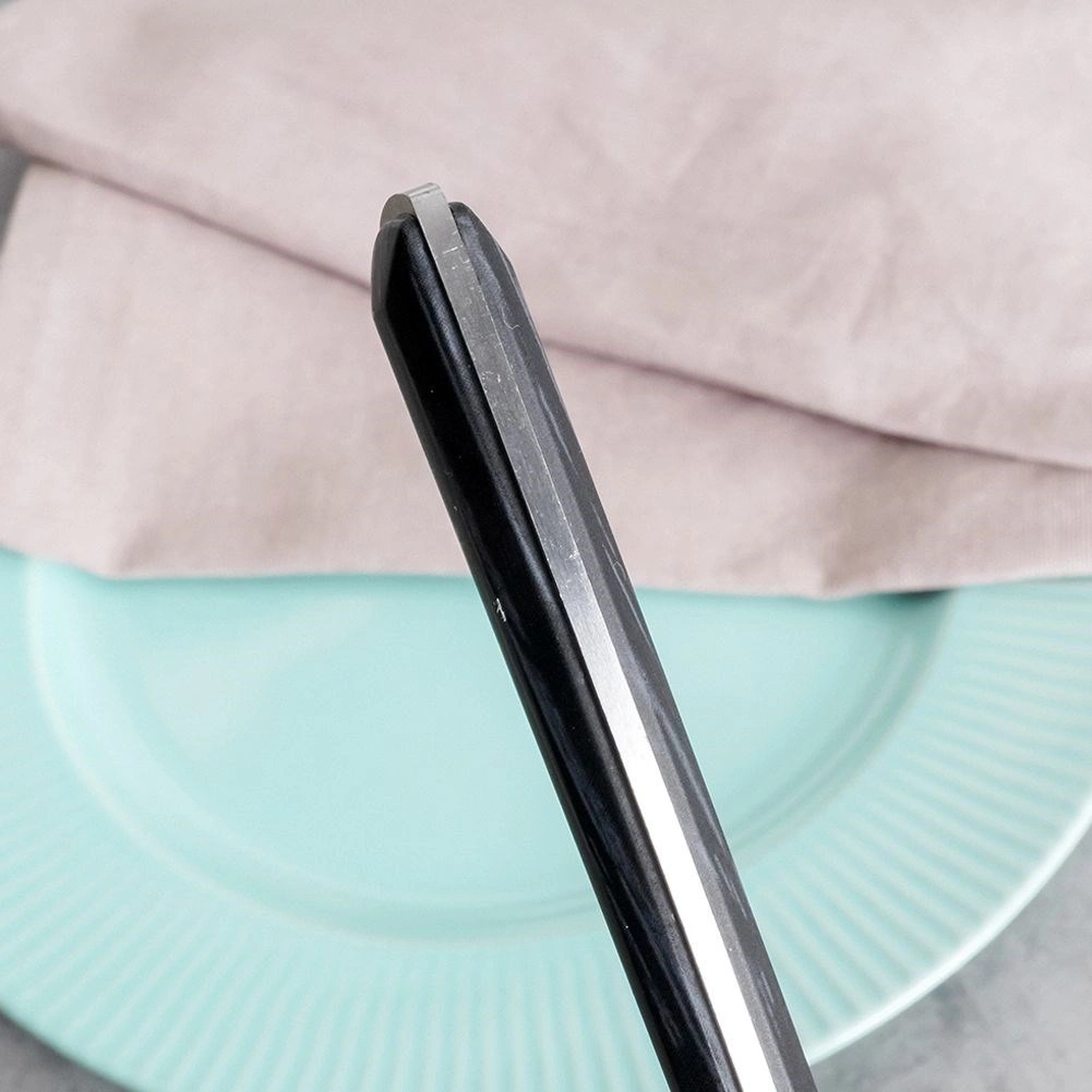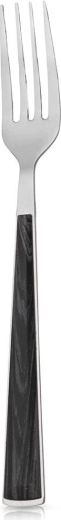 A sötét, fahatású nyél modern megjelenést és kényelmes fogást ad, amely jól illeszkedik különféle terítékekhez.