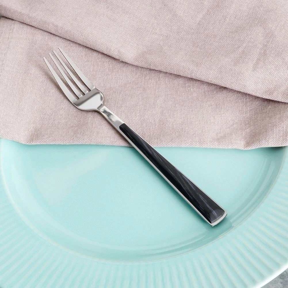 Az ARYA stílusos desszertvillája a polírozott rozsdamentes acél és a sötét, fahatású nyél kombinációjával tűnik ki. 18 cm-es hossza kényelmes fogást biztosít, tökéletes torták, piték és finom desszertek tálalásához. Minimalista dizájnja szépen illik a különféle terítékekhez.