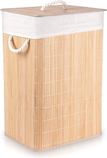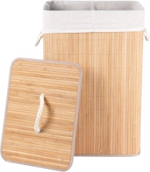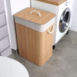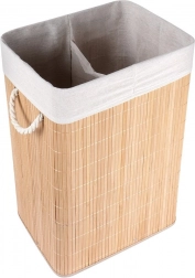 Stílusos és tágas, 70 l űrtartalmú bambusz szennyestartó, két rekesszel az egyszerű szétválogatáshoz. Stabil szerkezettel, levehető fedéllel a szagok ellen és kivehető len betéttel a kényelmes tisztításhoz. A praktikus kötélfogantyúk megkönnyítik a hordozást. Ideális kiegészítő fürdőszobába vagy mosókonyhába, természetes stílusban.
