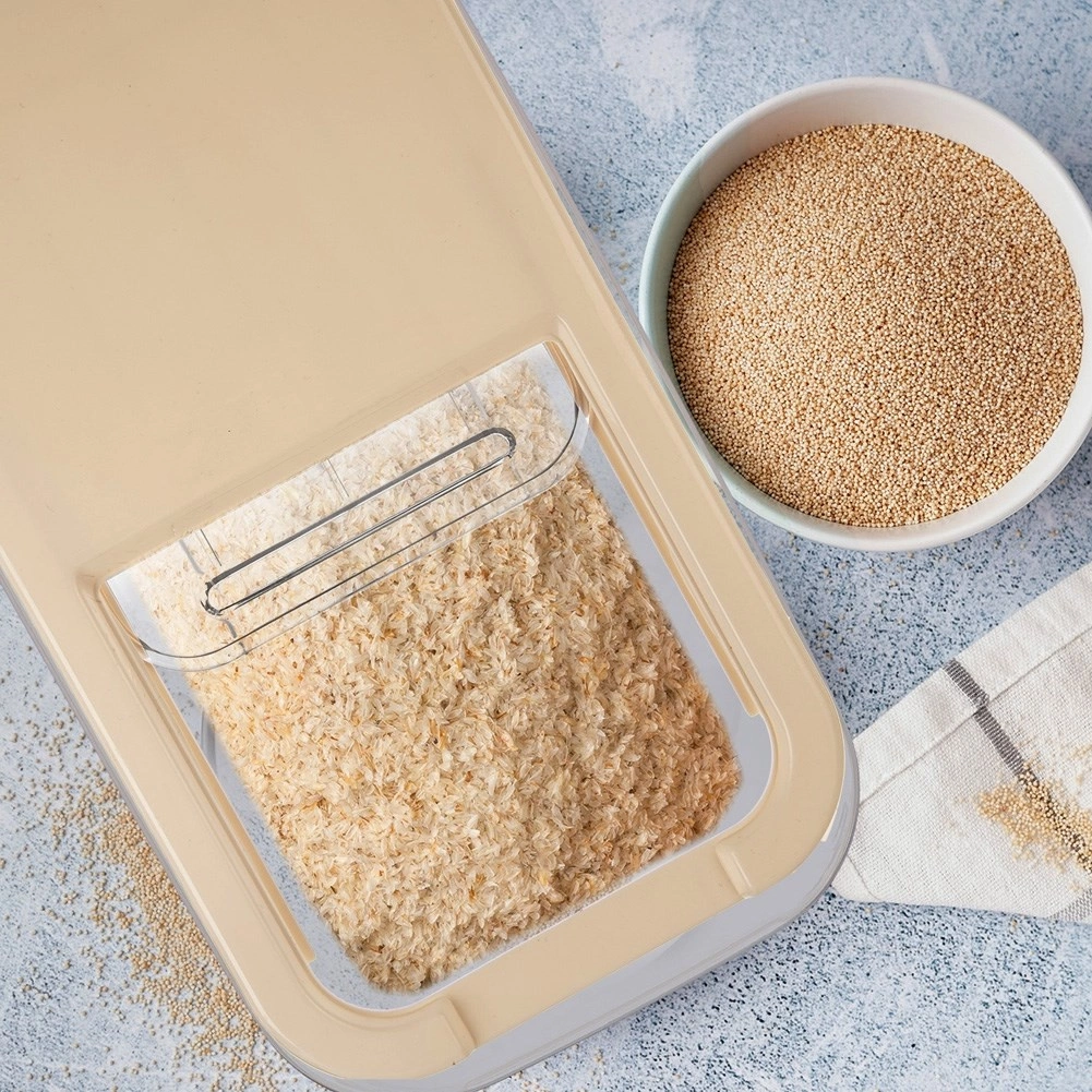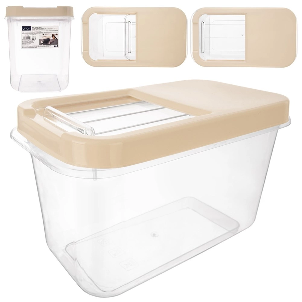 Praktikus, 10 l űrtartalmú tároló átlátszó testtel és tolófedéllel bézs színben a könnyű adagoláshoz. Alkalmas száraz élelmiszerek, mosókapszulák és mosópor, kedvtelésből tartott állatok eledele, valamint háztartási apróságok tárolására. BPA-mentes, biztonságos műanyagból készült, könnyen tisztítható, és az átlátszó oldalfalaknak köszönhetően mindig látható a tartalom.