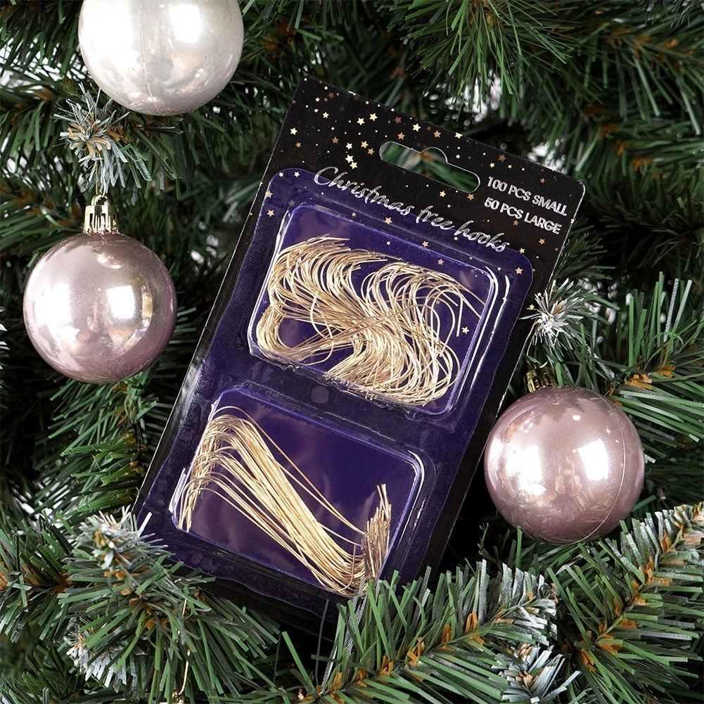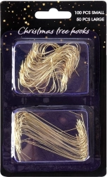 Praktikus készlet 150 arany kampóból karácsonyi díszek és gömbök felakasztásához a fára. Tartalmaz 100 kisebb (4 cm) és 50 nagyobb (6 cm) kampót, amelyek erősek, többször használhatók, és ergonomikus formájuknak köszönhetően gyors és biztonságos felakasztást tesznek lehetővé még gyerekek számára is.