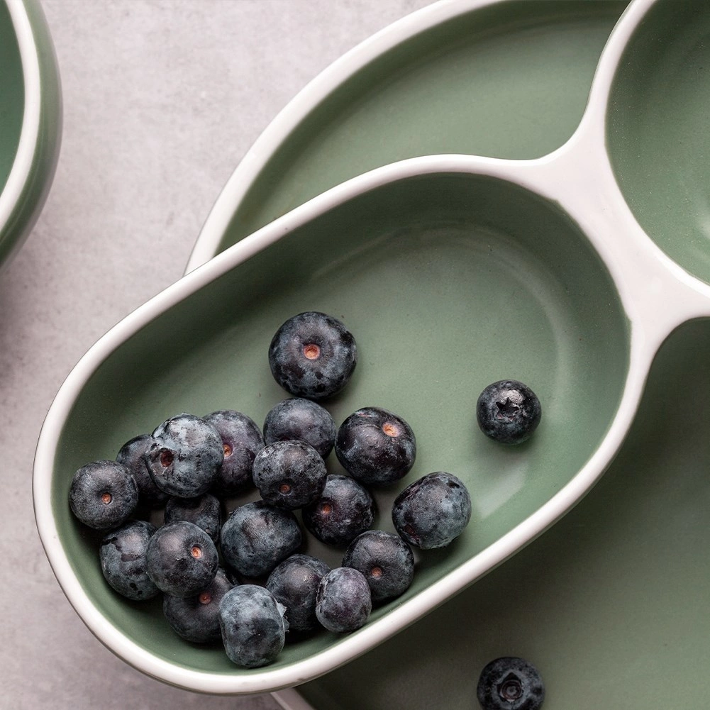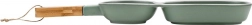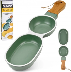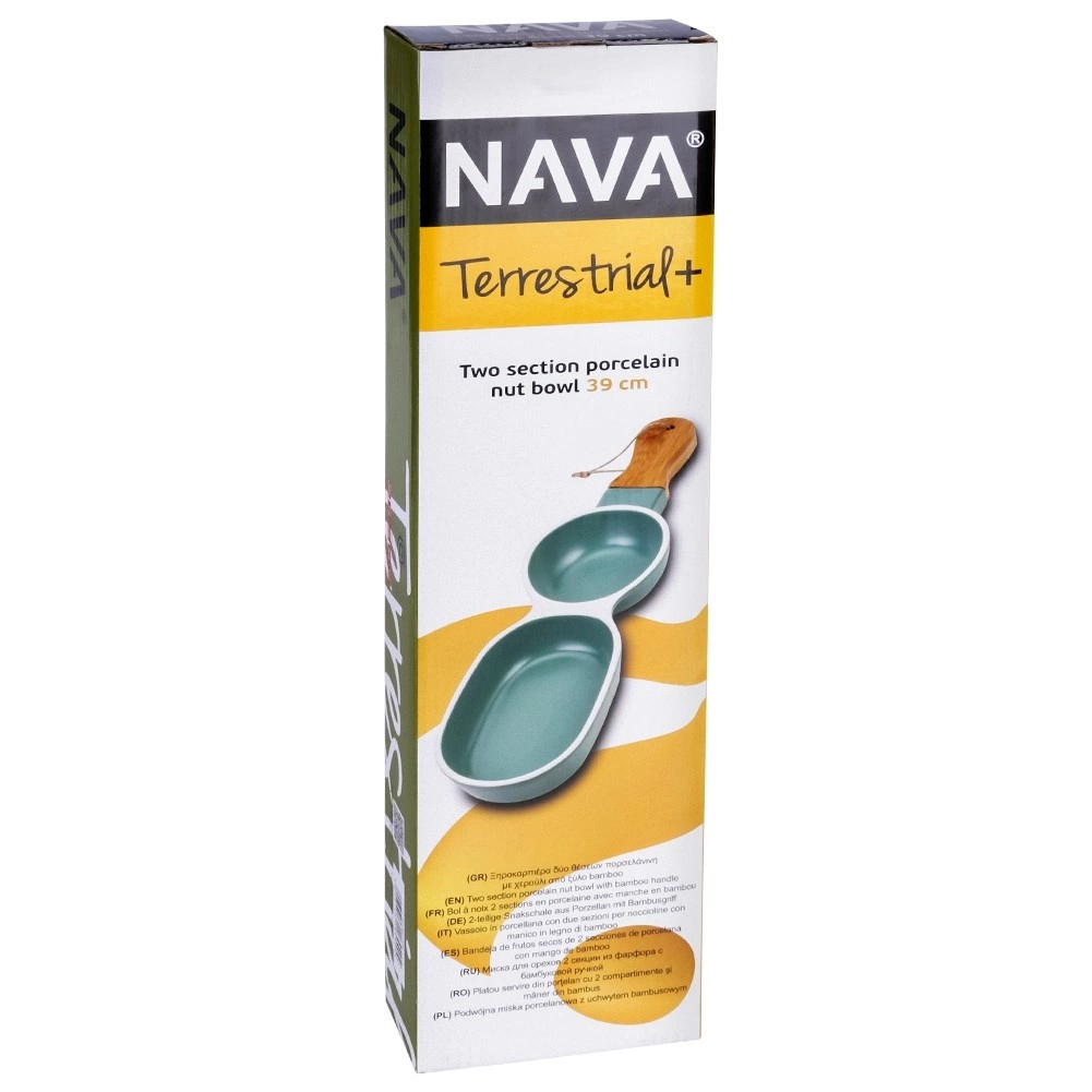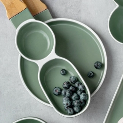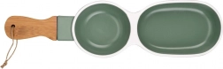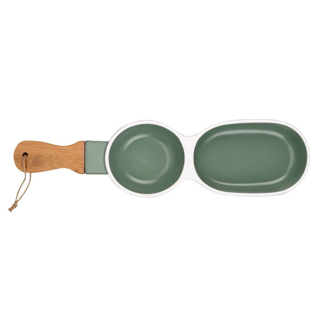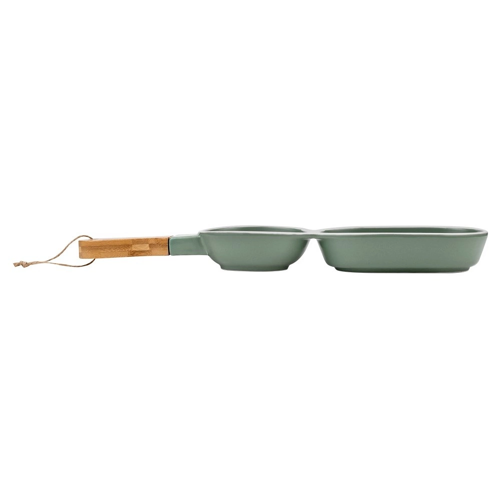 Stílusos porcelán előételtál bambusz fogantyúval az egyszerű tálaláshoz. Két különálló rekesszel rendelkezik különféle falatokhoz vagy mártogatósokhoz, tartós kivitelben, minőségi porcelánból, elegáns zöld színben fehér szegéllyel. Ideális olívához, magvakhoz, aszalt gyümölcshöz és szószokhoz, otthonra és vendéglátásba egyaránt.