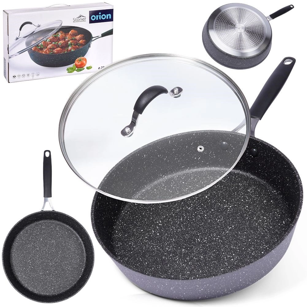 Praktikus, 28 cm átmérőjű gránit serpenyő üvegfedővel, amely tapadásmentes felületet, egyenletes hőeloszlást és sokoldalú használatot kínál minden tűzhelytípuson, beleértve az indukciót is. Tartós alumíniumöntvény testtel és kőhatású bevonattal, sütőben 200 °C-ig használható, és könnyen tisztítható – mosogatógépben is mosható.