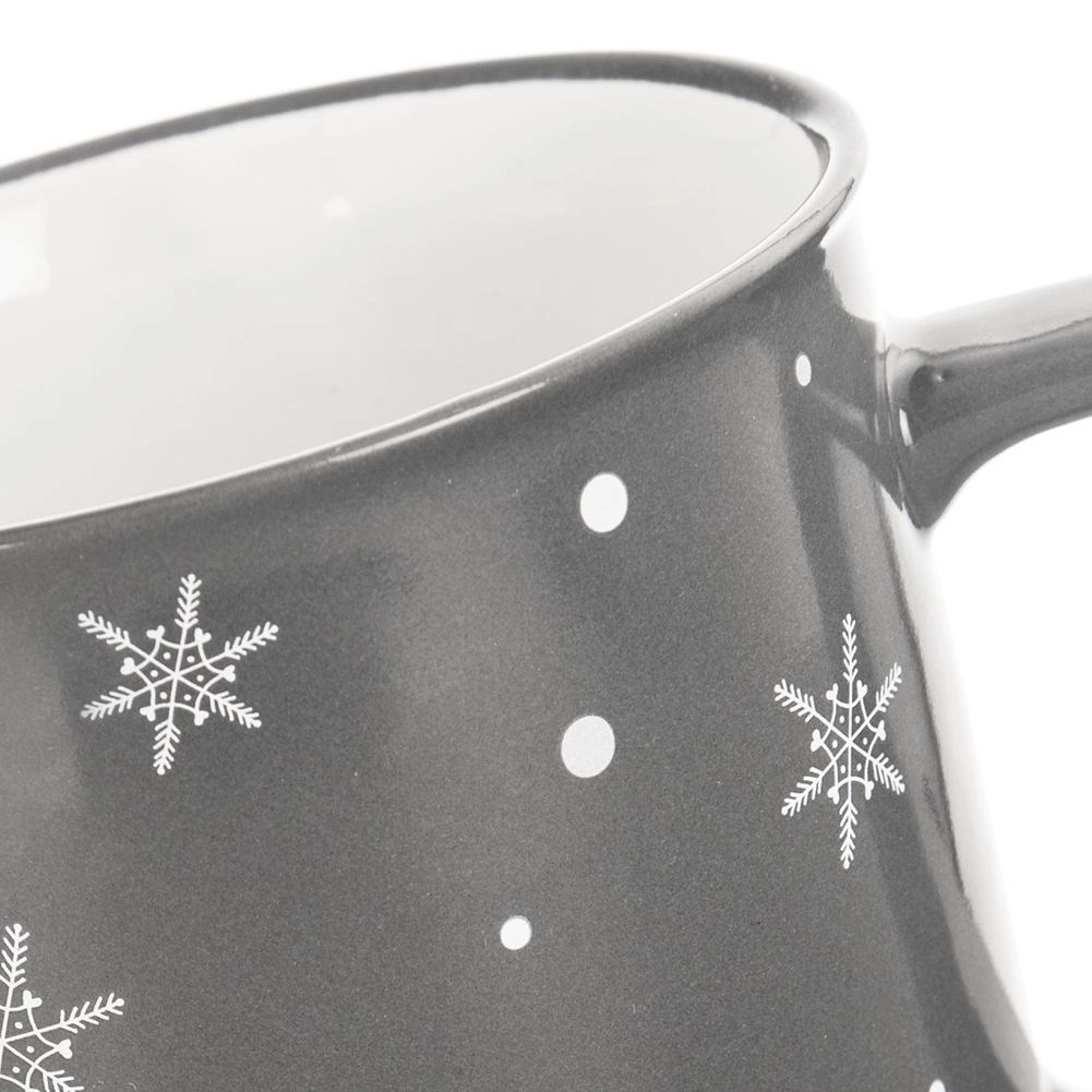 Stílusos 500 ml űrtartalmú kerámia bögre sötétszürke színben, fehér hópehely mintával, ideális teához, kávéhoz, kakaóhoz és gyógynövényes italokhoz. Kényelmes, nagy füllel rendelkezik, mosogatógépben mosható, és az italok mikrohullámú sütőben melegíthetők benne – tökéletes választás téli és karácsonyi időszakra, valamint mindennapi használatra is.