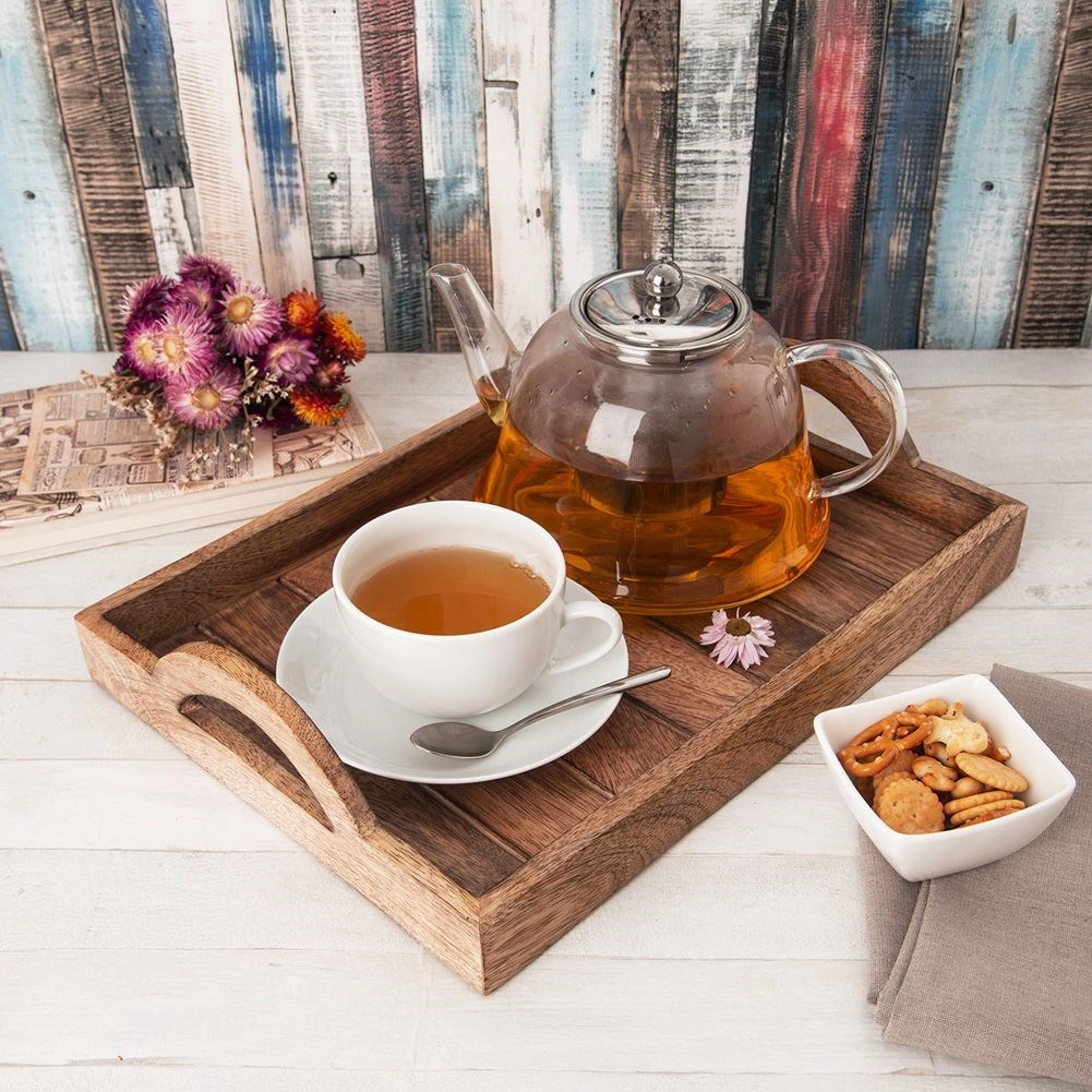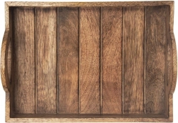 A téglalap alakú mangófa szervírozótálca szilárdságával, nedvességállóságával és természetes erezetével tűnik ki. Az integrált fogantyúknak köszönhetően kényelmesen vihető a kávé, tea, desszert vagy akár egy teljes reggeli is. Az alján lévő csúszásgátló betétek védik az asztalt és stabilitást nyújtanak.
