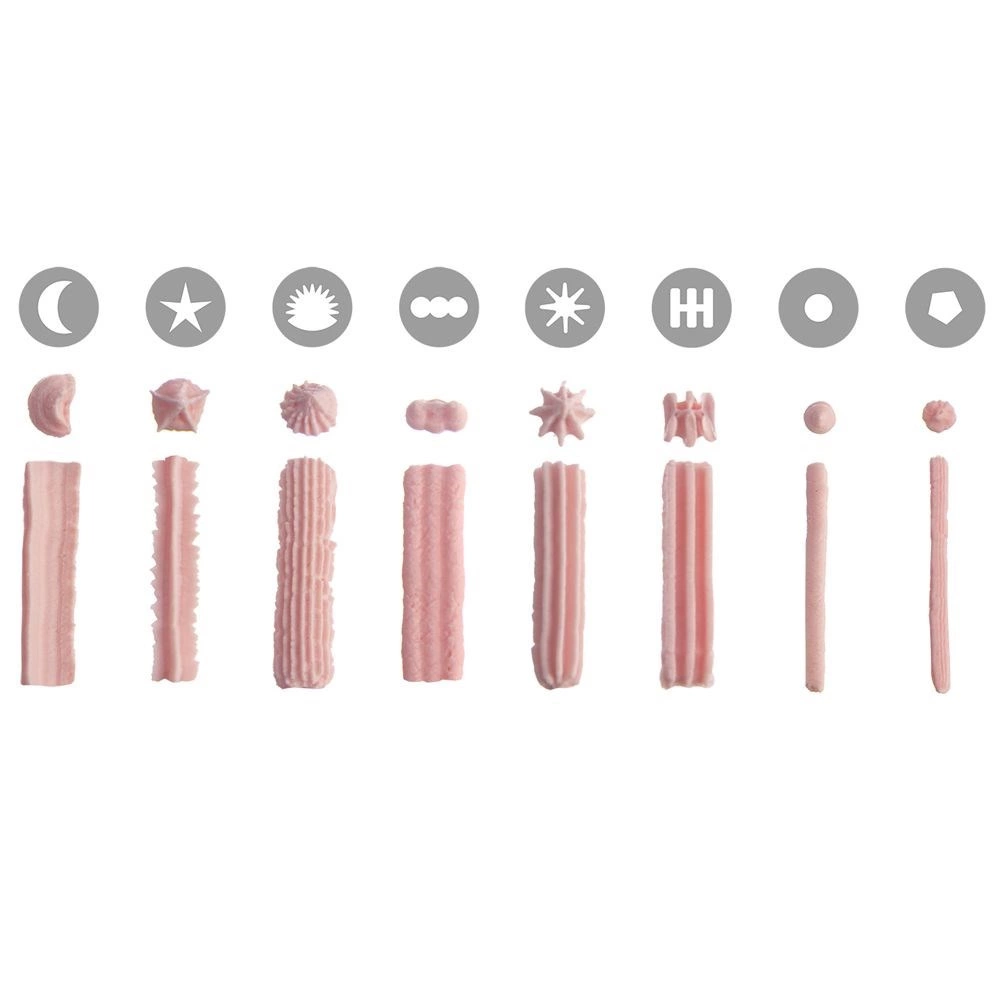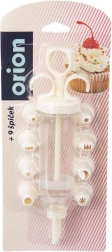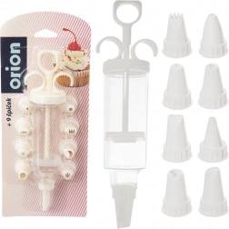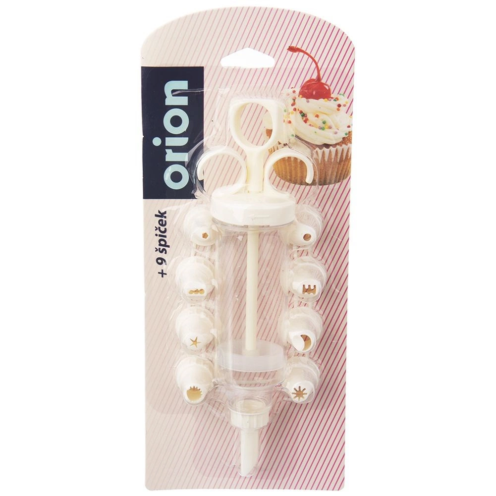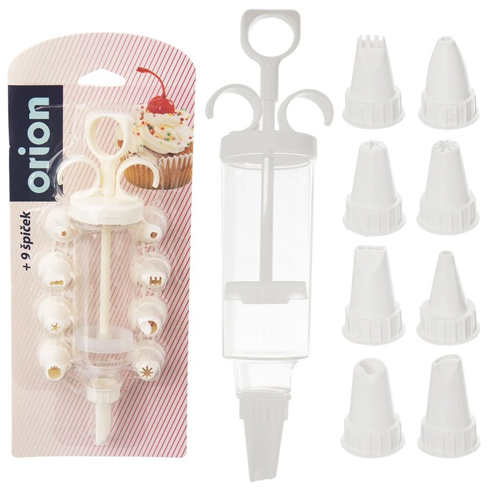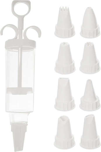 Praktikus készlet torták, sütemények és falatkák díszítéséhez 9 cserélhető csőrvéggel és pontos, dugattyús adagolással. Tartós kivitel minőségi műanyagból, átlátszó testtel a krém mennyiségének ellenőrzéséhez és könnyű használattal és tisztítással. Ideális krémekhez, tejszínhez és töltelékekhez.