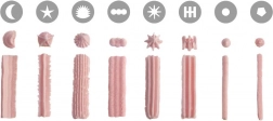 A készlet különböző formájú csőrvégeket tartalmaz – kerek, csillag, lapos és szirmos – profi díszítésekhez otthon is.