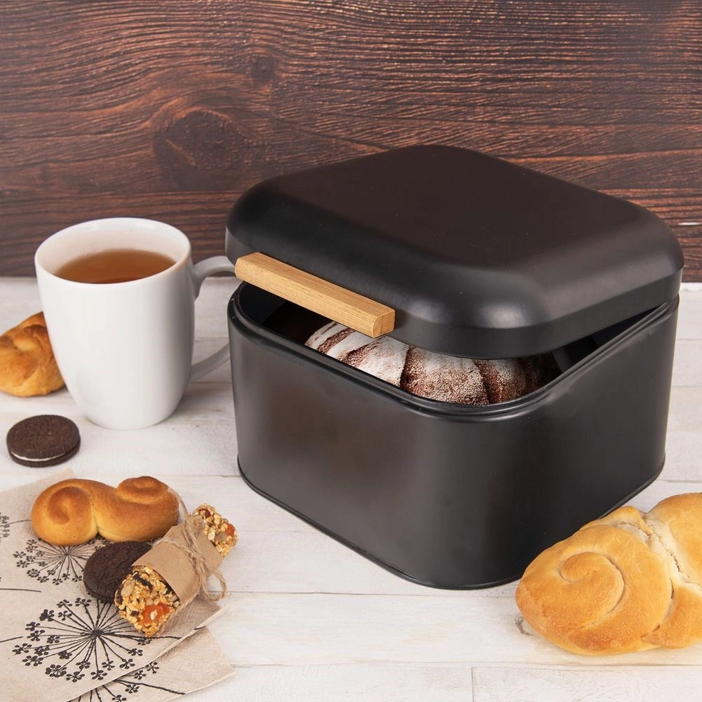 Ez a fekete fém kenyértartó a minimalista megjelenést praktikus funkciókkal ötvözi. A felnyitható fedél bambusz fogantyúval a két erős zsanérnak köszönhetően kényelmesen nyílik, így bármikor könnyen hozzáférhet a pékáruhoz. Kompakt mérete ideális egy kisebb kenyérhez, néhány zsemléhez vagy croissanthoz.