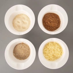 - Péksütemény (zsemlemorzsa), dió, csokoládé, félkemény és kemény sajtok, zöldségek, gyümölcsök, fűszerek