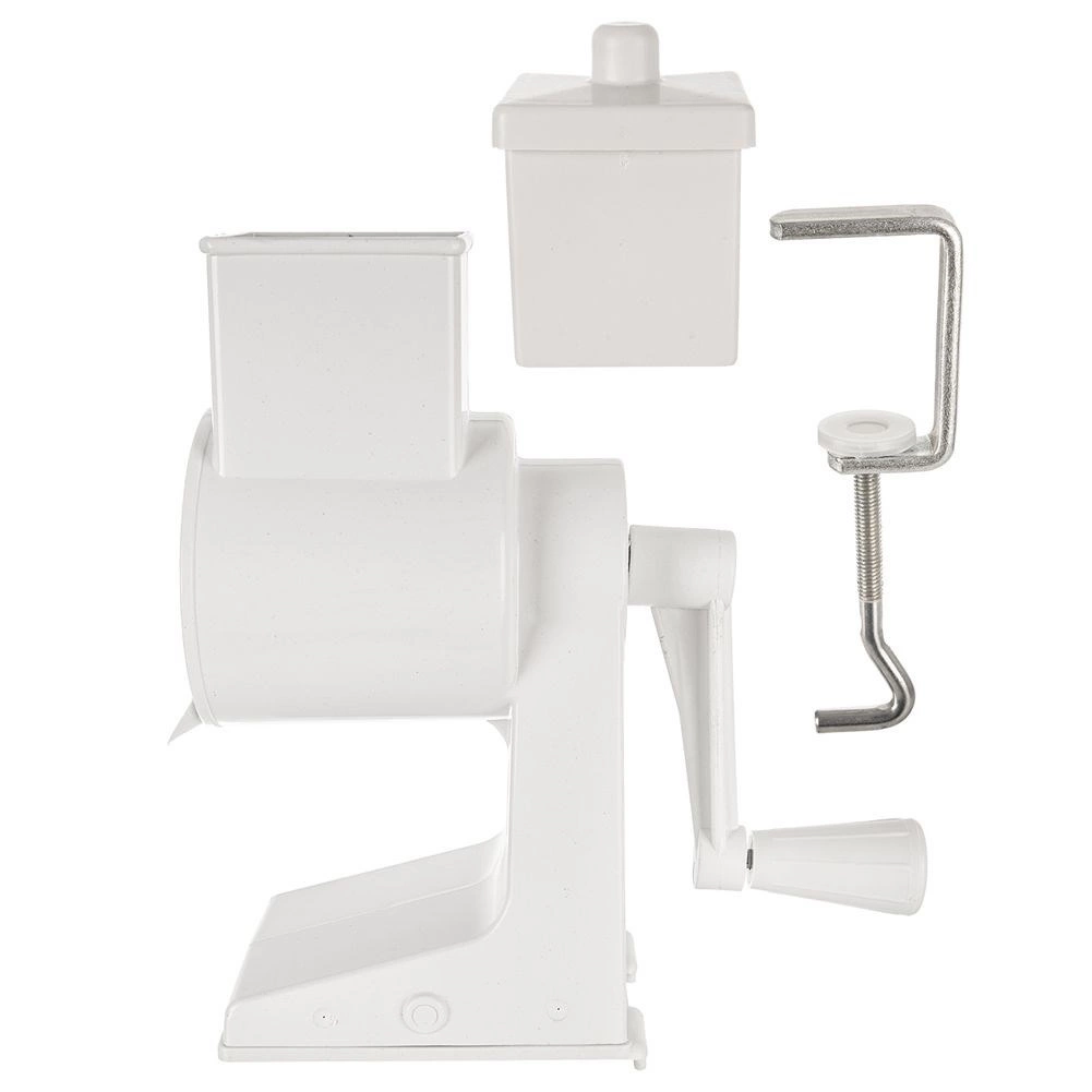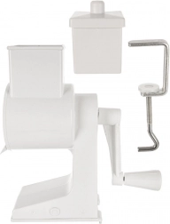 Fedezze fel a megbízható kézi reszelőt, amely nélkülözhetetlen segítőtárs lesz minden konyhában. A fehér színű, masszív műanyag ház és a rozsdamentes acél dob hosszú élettartamot és könnyű karbantartást garantál. A munkalaphoz való csavaros rögzítésnek (max. 5,5 cm) köszönhetően használat közben tökéletesen stabil marad.