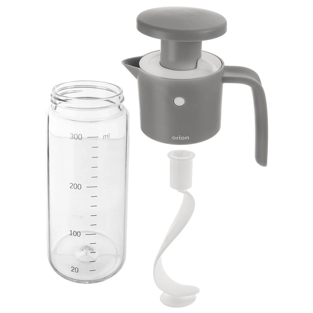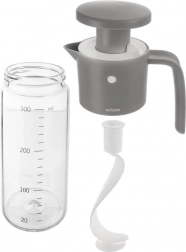 Ez a sokoldalú palack kézi mixer módjára működik – a zárókupakban lévő dugattyú hajtja a spirális keverőt, amely gyorsan és egyenletesen köti össze az összetevőket, például olajat, ecetet, mézet, mustárt vagy fűszereket. A 20–300 ml-ig, 20 ml-es lépésekben beosztott integrált mérőpohár pontos arányokat biztosít minden recepthez.