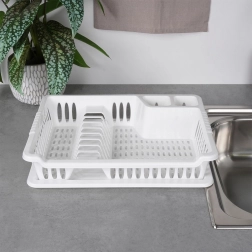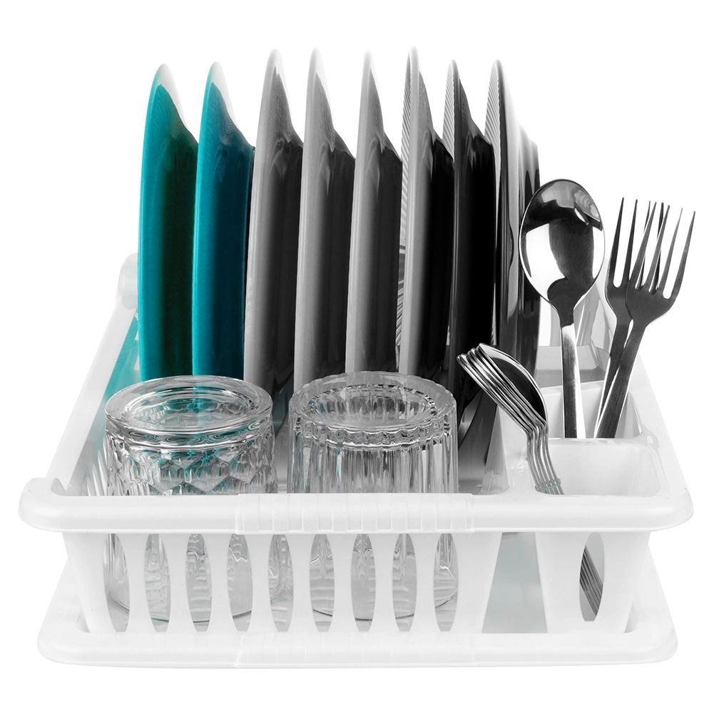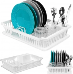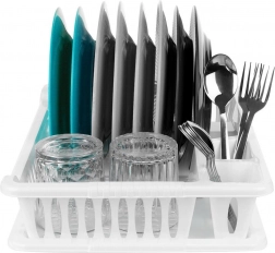 A praktikus, fehér edényszárító 40 × 29 × 8,5 cm méretben megkönnyíti a tányérok, poharak és evőeszközök szárítását, miközben védi a konyhapultot. Rendelkezik kivehető csepegtetőtálcával, helyet biztosít 8 tányérnak, evőeszköztartó rekeszekkel és hellyel a bögréknek. Könnyen tisztítható, BPA-mentes, klasszikus kialakítása pedig nagyszerűen illik modern és hagyományos konyhákba is.