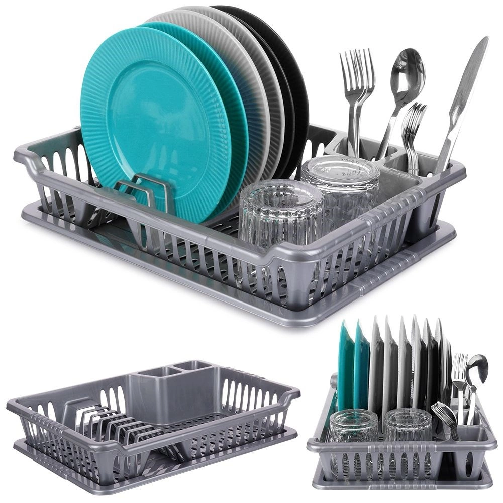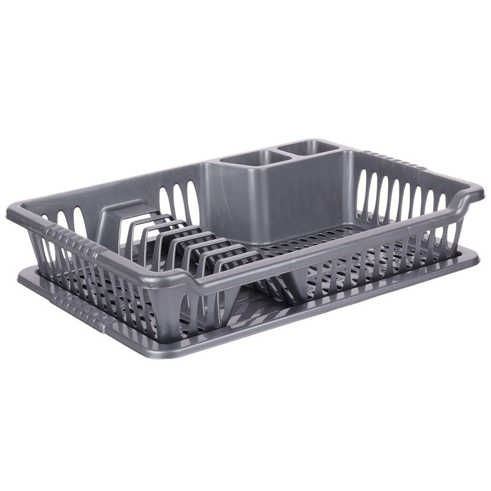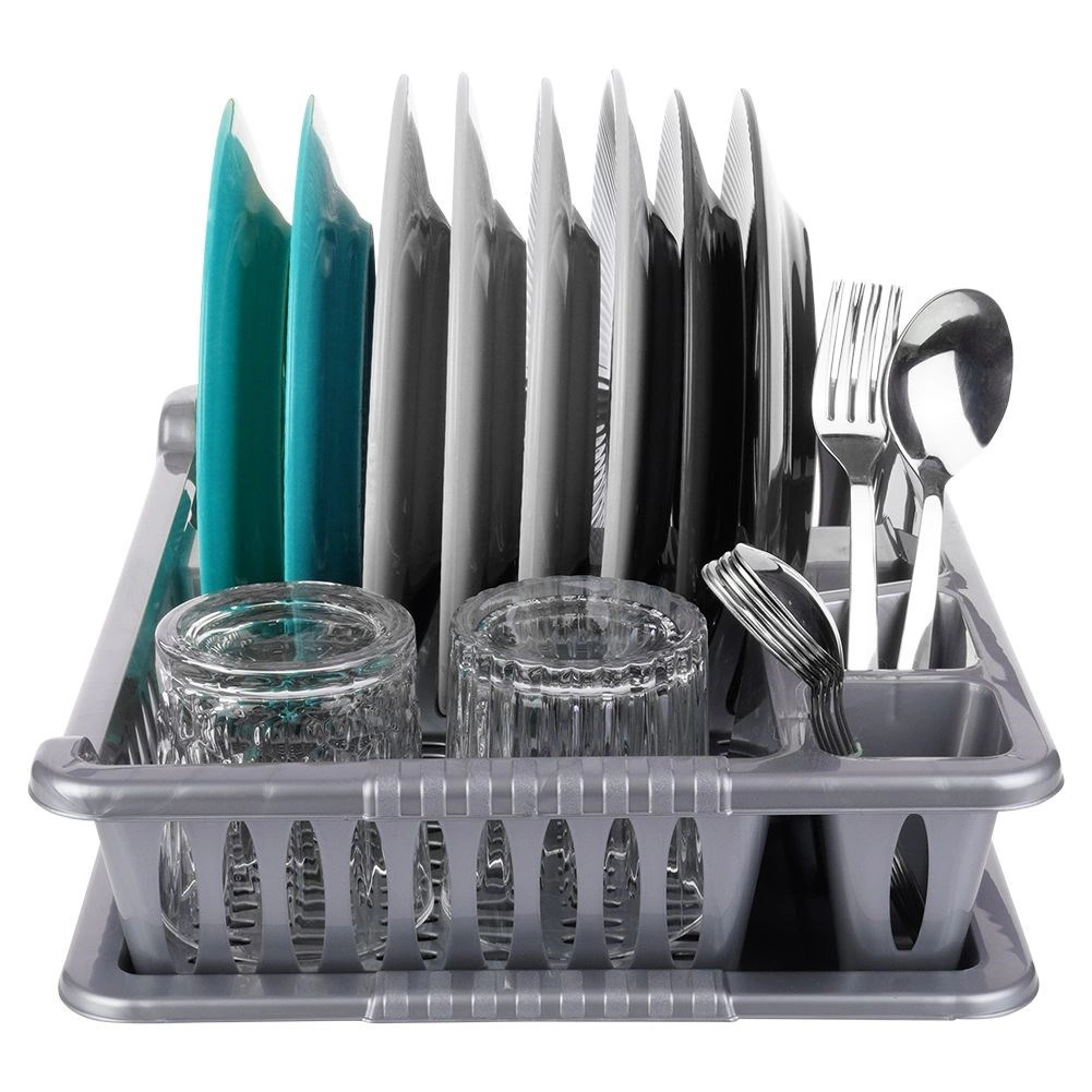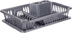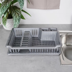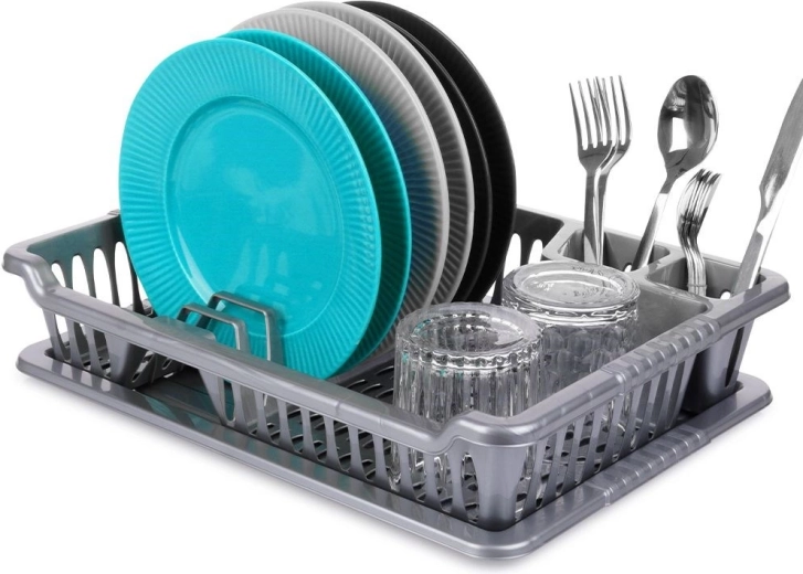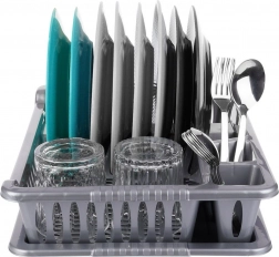 Praktikus szürke edényszárító 40 × 29 × 8,5 cm méretben, amely szárazon tartja a konyhapultot és rendezetten tárolja az edényeket. Kivehető csepegtetőtállal, tányérok, bögrék és evőeszközök számára kialakított helyekkel, BPA-mentes, minőségi műanyagból. Ideális mindennapos használatra, könnyen tisztítható, modern és klasszikus konyhákba egyaránt illik. BPA-mentes, kivehető tálca, hely 8 tányérnak, praktikus evőeszköztartók.