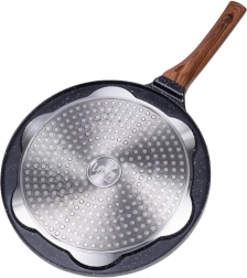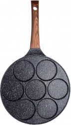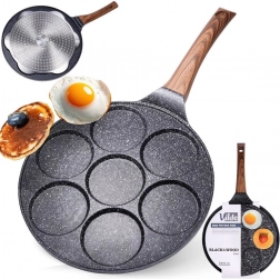 Univerzális tojás- és palacsintasütő 7 kerek formával, 8 cm átmérővel a tökéletes forma és az egyenletes átsülés érdekében. Tartós alumíniumtest tapadásmentes gránit bevonattal, amely minimális zsiradékkal történő főzést tesz lehetővé; a fa hatású ergonomikus nyél kényelmes és biztonságos. A egyenletes hőeloszlásnak köszönhetően időt és energiát takarít meg, és alkalmas gáz-, elektromos-, kerámia-, halogén- és indukciós főzőlapokra is.