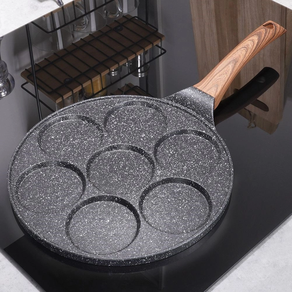 Készítsen tökéletesen kerek tükörtojást, palacsintát vagy mini amerikai palacsintát – ez a 7 mélyedéssel ellátott serpenyő megkönnyíti minden reggeli menü elkészítését. A gránit tapadásmentes réteg fekete–szürke „kőhatású” megjelenéssel megakadályozza a leégést, és egészségesebb sütést tesz lehetővé minimális olajjal. A BLACK&WOOD stílusos kombináció remekül illik a modern konyhákba.