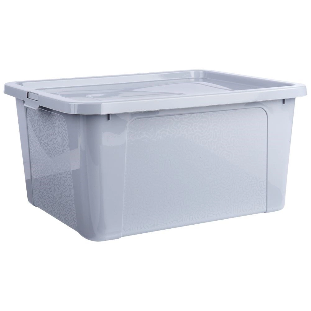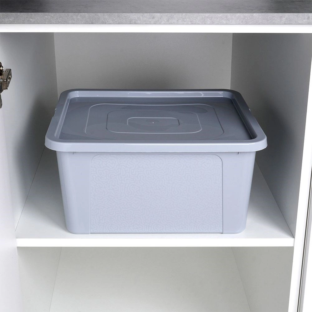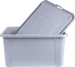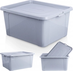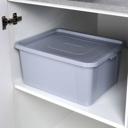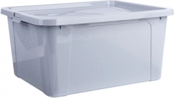 Praktikus, 20 l űrtartalmú tárolódoboz fedéllel, amely segít rendet tartani otthon, az irodában és a műhelyben. Tartós műanyagból készült, világosszürke színben, könnyű, egymásra rakható, és a lekerekített sarkaknak köszönhetően biztonságosan kezelhető. A fedél pattintós zárral záródik, így védi a tartalmat a portól és a nedvességtől. Ideális játékokhoz, textíliákhoz, ruhákhoz, konyhai kiegészítőkhöz vagy szerszámokhoz. Méretek: 40 × 33 × 20 cm, űrtartalom 20 l.