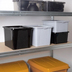 A 20 l-es fedeles tárolódoboz megbízható megoldás az áttekinthető rendszerezéshez otthon és az irodában. A masszív, mégis könnyű műanyagnak és a pontosan illeszkedő fedélnek köszönhetően szárazon és pormentesen tartja a tárgyakat, miközben helyet takarít meg a polcokon, szekrényekben és állványokon.