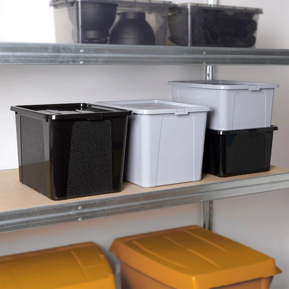 A lapos fedélnek és a stabil oldalfalaknak köszönhetően a dobozok biztonságosan egymásra rakhatók, így maximalizálható a tárolóhely otthon, az irodában vagy a garázsban.