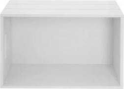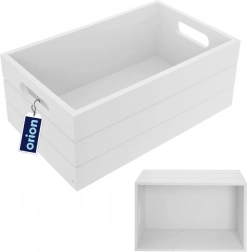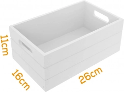 Praktikus, fehér színű fa tárolóláda, amely rendet teremt bármely helyiségben. Mérete 26 × 16 × 11 cm, kényelmes oldalsó fogókkal és masszív, természetes fából készült szerkezettel. Remekül használható kozmetikumokhoz, irodaszerekhez, élelmiszerekhez vagy dekorációkhoz, és univerzális kialakításának köszönhetően illik a klasszikus és modern enteriőrökhöz is. Tartós kivitel, könnyű hordozhatóság és sokoldalú felhasználás.