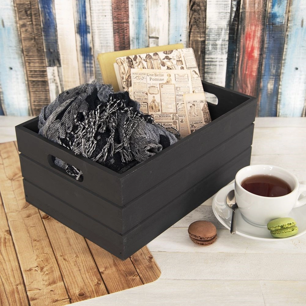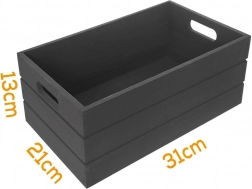 Sokoldalú fa doboz elegáns fekete kivitelben, amely segít rendet tartani bármely helyiségben. A masszív fának és a két oldalsó nyílásnak köszönhetően könnyen hordozható és ellenáll a mindennapi használatnak. Polcra, komódra és íróasztalra egyaránt illik.