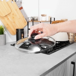 A szellőzőnyílásnak köszönhetően a fedő kiengedi a felesleges gőzt és csökkenti a kifutás kockázatát. Enyhén domború formája elősegíti a forró levegő cirkulációját és az egyenletes sütés-főzést. A magas perem stabil, csaknem hermetikus illeszkedést biztosít az edényeken, és jobban tartja a hőt. A fedő mosogatógépben mosható, és akár 200 °C-ig hőálló.