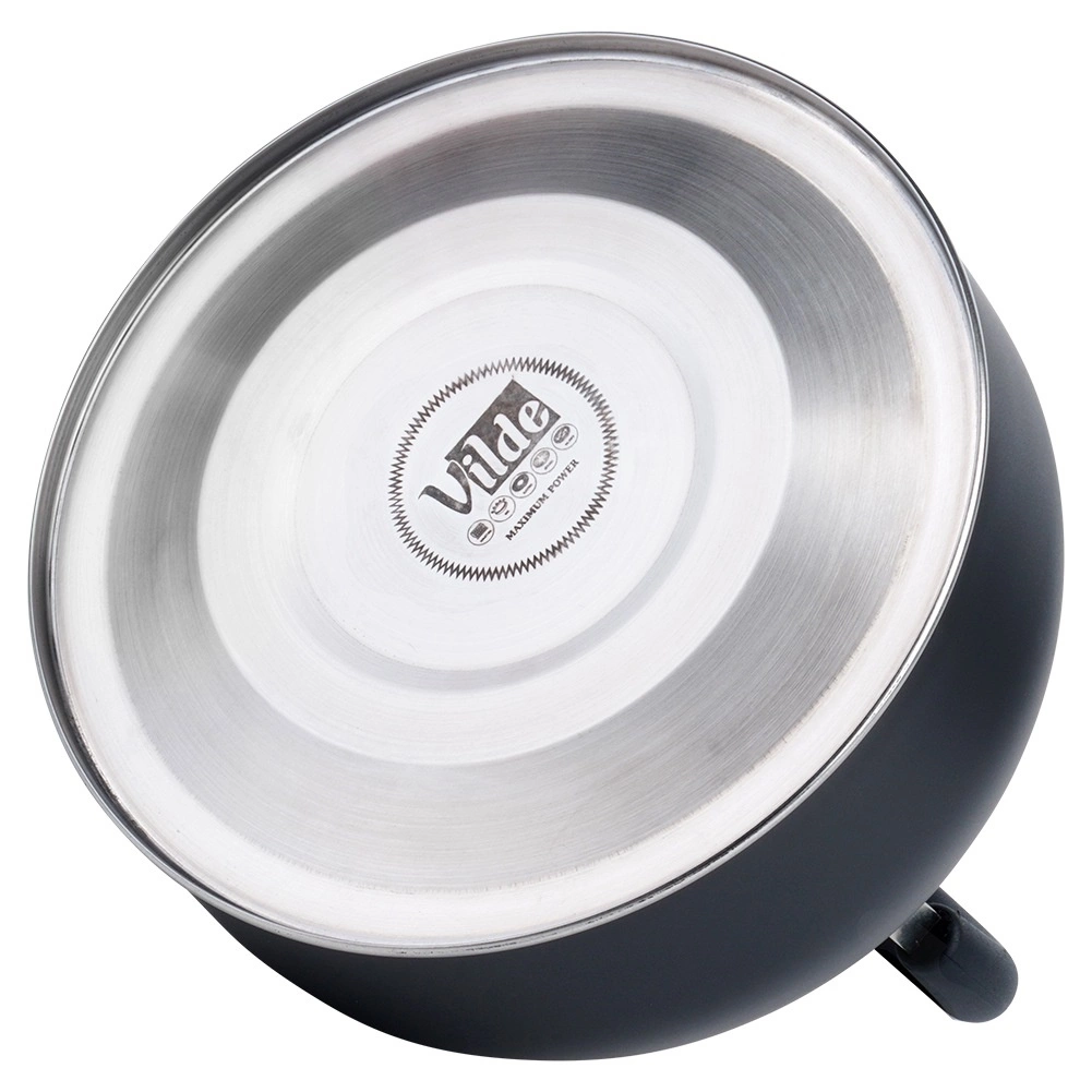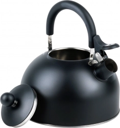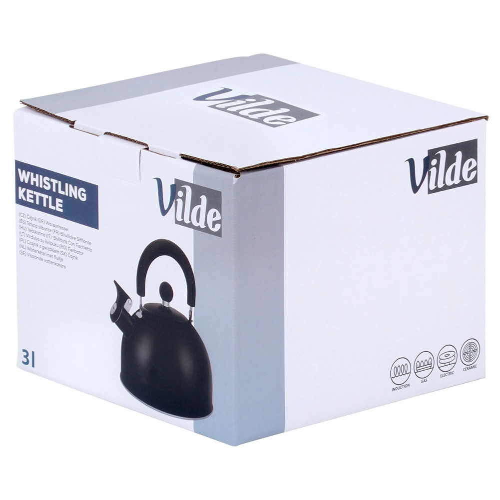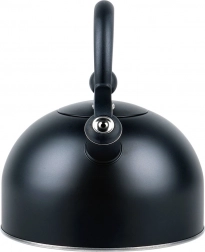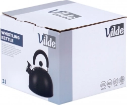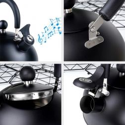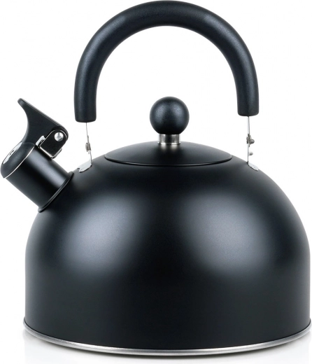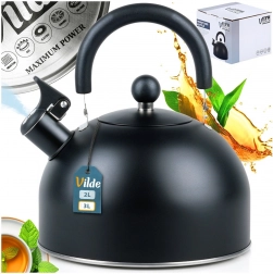 Stílusos fekete, rozsdamentes acél vízforraló 3 l űrtartalommal (hasznos űrtartalom 2,4 l), kényelmes, lehajtható fogantyúval és síppal. A akutermikus talp gyors felfűtést és energia-megtakarítást biztosít még alacsony teljesítményen is. Alkalmas gáz-, elektromos, üvegkerámia és indukciós főzőlapokra. Elegáns, matt kivitel, könnyen tisztítható.