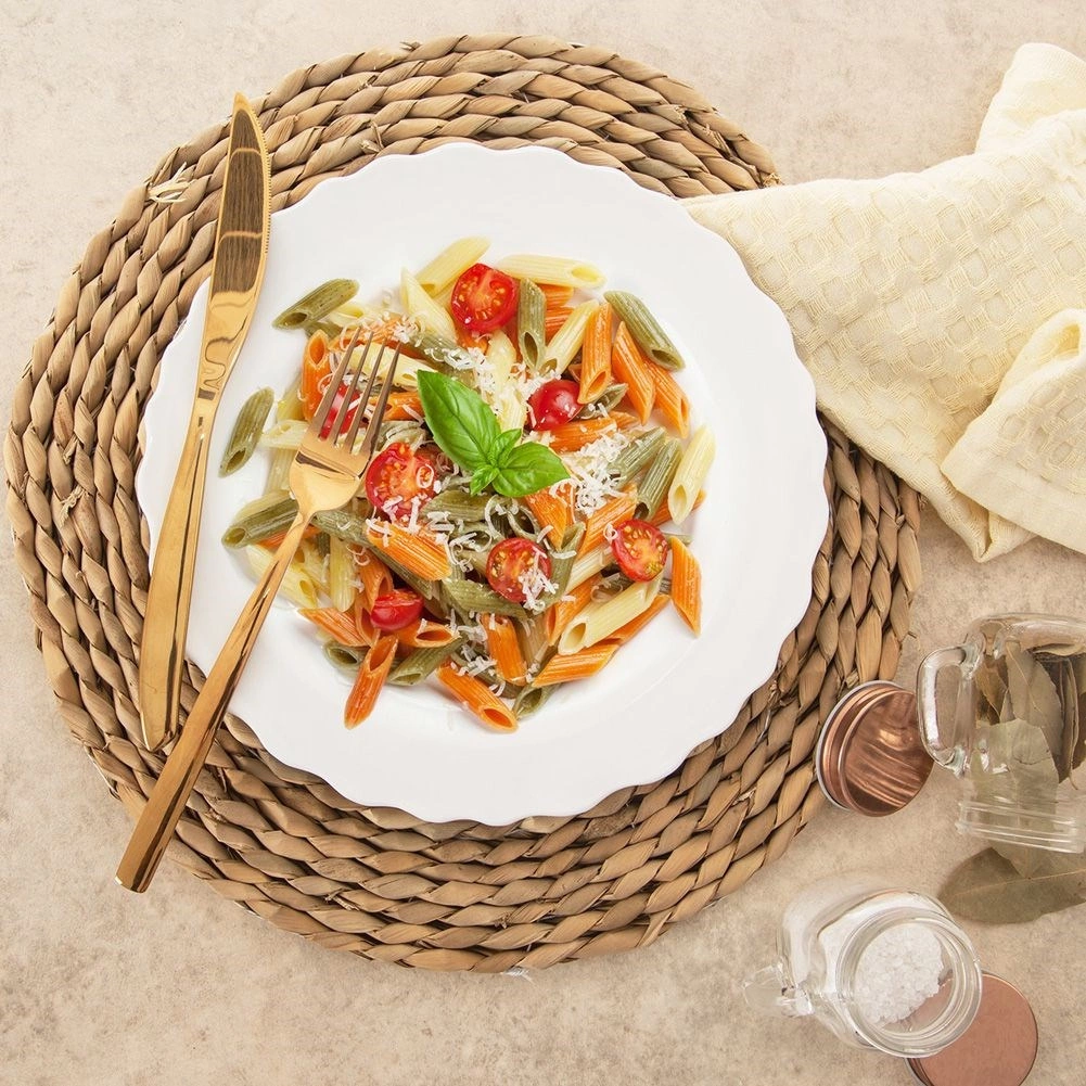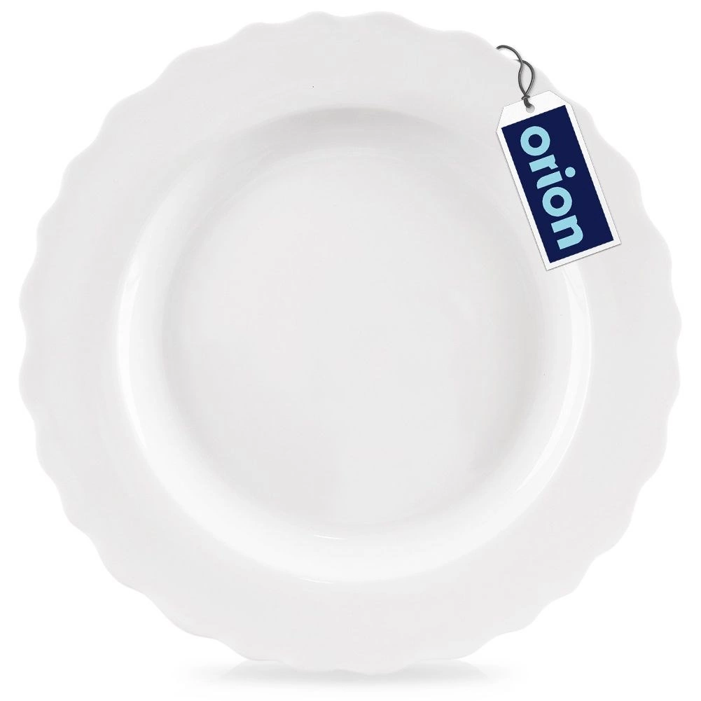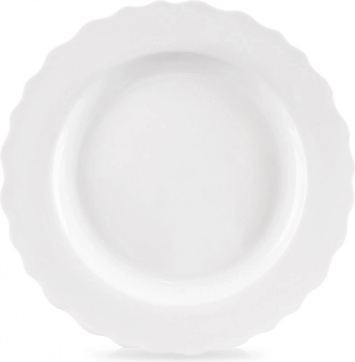 Elegáns porcelán lapostányér, 24,5 cm átmérővel, mindennapi tálaláshoz és ünnepi asztalhoz egyaránt illik. Klasszikus fehér dizájn, dekoratív hullámos perem jellemzi, mosogatógépben mosható és mikrohullámú sütőben használható, a minőségi porcelánmáz pedig hosszú élettartamot biztosít.