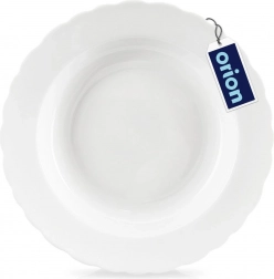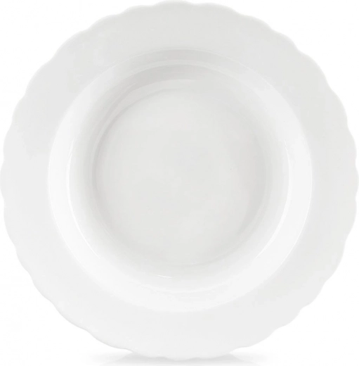 Elegáns, mély fehér porcelántányér hullámos peremmel, mindennapi terítékhez és ünnepi alkalmakra is ideális. A 24 cm-es átmérőnek és a 350 ml-es űrtartalomnak köszönhetően tökéletes levesekhez, tésztákhoz és krémekhez. Tartós, könnyen tisztítható, mosogatógépben mosható és mikrohullámú sütőben használható.