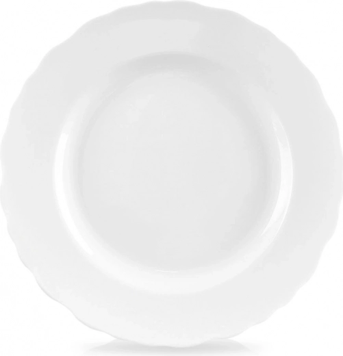 Elegáns, 19,5 cm átmérőjű porcelán desszerttányér hullámos peremmel, ideális torták, desszertek és harapnivalók tálalásához. Minőségi fehér porcelánból készült, mosogatógépben mosható és mikrohullámú sütőben használható, klasszikus dizájnja pedig remekül illik bármilyen terítékhez.