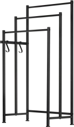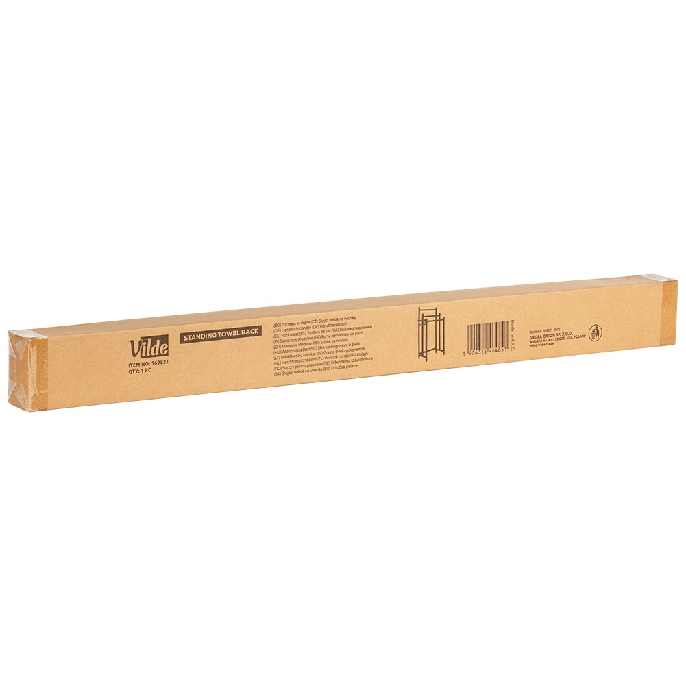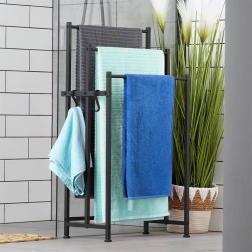 Az elegáns, fekete színű, szabadon álló törölközőtartó tartós fém szerkezetet, három, különböző magasságban elhelyezett rúdat és két oldalsó akasztót kínál a kisebb törölközők számára. Az állítható lábakkal ellátott stabil talp szilárd és biztonságos használatot biztosít fúrás nélkül. Minimalista, loft stílusú kialakítása remekül illik modern és klasszikus fürdőszobákba is.