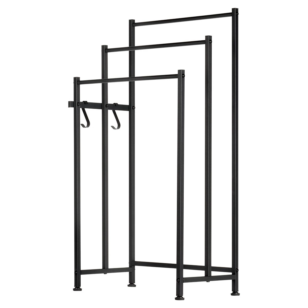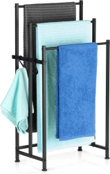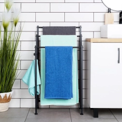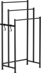 A szabadon álló fém törölköző- vagy ruhatartó praktikus segítség minden fürdőszobába, mosókonyhába vagy wellness térbe. A matt fekete, porszórt felület karcálló és könnyen tisztítható. A három rúdnak köszönhetően a törölközők gyorsabban száradnak és áttekinthetően rendezettek maradnak.