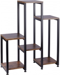 Stílusos fém virágtartó állvány hat polccal öt szinten, amely elegánsan kiemeli növényeit és dekorációit. A masszív fekete fém és a rusztikus MDF fa polcok biztosítják a magas stabilitást, tartósságot és az ipari loft stílust, amely illik a nappaliba, dolgozószobába és fedett erkélyre is. Teljes méret 62 × 24 × 80 cm, teherbírás akár 60 kg.