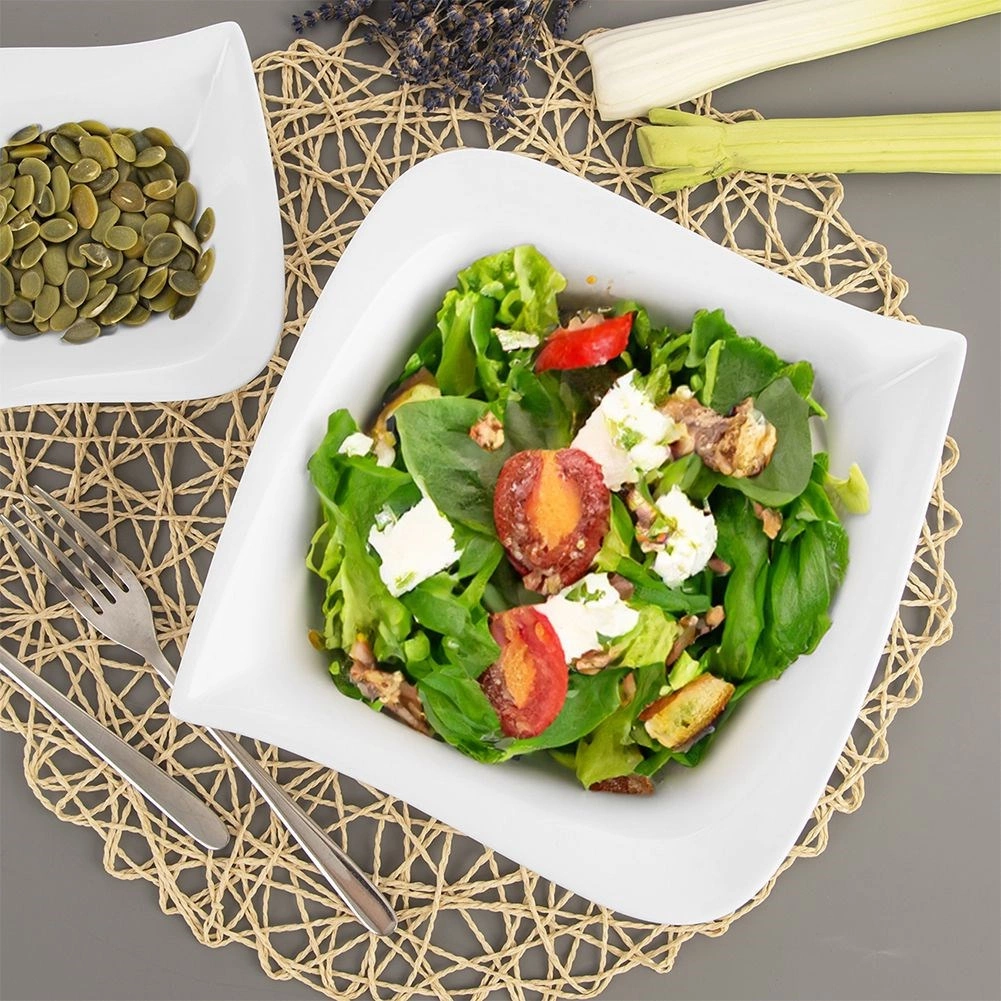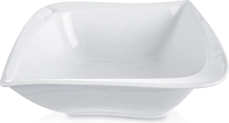 Stílusos tál minőségi porcelánból, fehér színben – kiváló választás a mindennapi terítéshez és az ünnepi alkalmakhoz is. Mélyebb profiljának és szabálytalan négyzet alakjának köszönhetően kényelmesen tálalhatók benne zöldség- és gyümölcssaláták, köretek vagy rágcsálnivalók, például chips és popcorn.