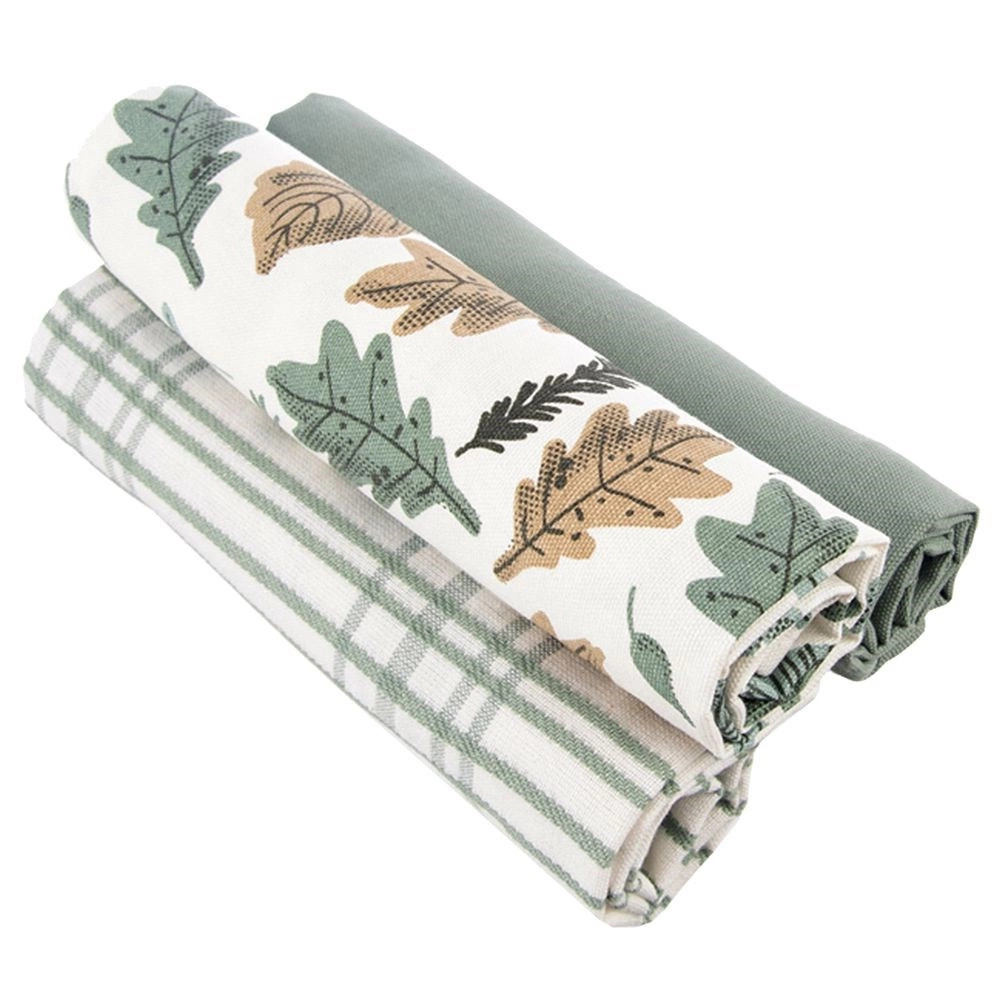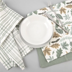 A leveles motívum, a zöld kockás és az egyszínű konyharuha kombinációja természetes hangulatot kölcsönöz a konyhának, és könnyen párosítható a kiegészítőkkel.