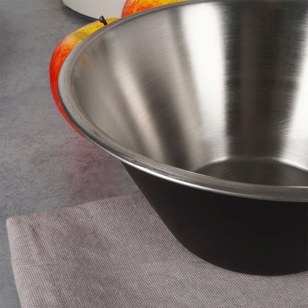 Ez a sokoldalú, kiváló minőségű rozsdamentes acélból készült, matt fekete külső felületű konyhai tál megbízható segítőtárs lesz a mindennapi főzésnél és az ünnepi tálalásnál is. A széles perem megkönnyíti a kezelést és a pontos kiöntést, a mély forma pedig tökéletes tésztákhoz, salátákhoz és krémekhez.