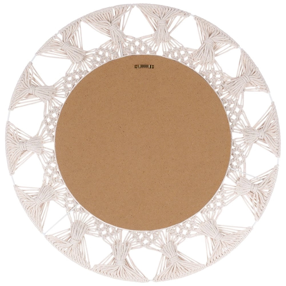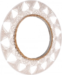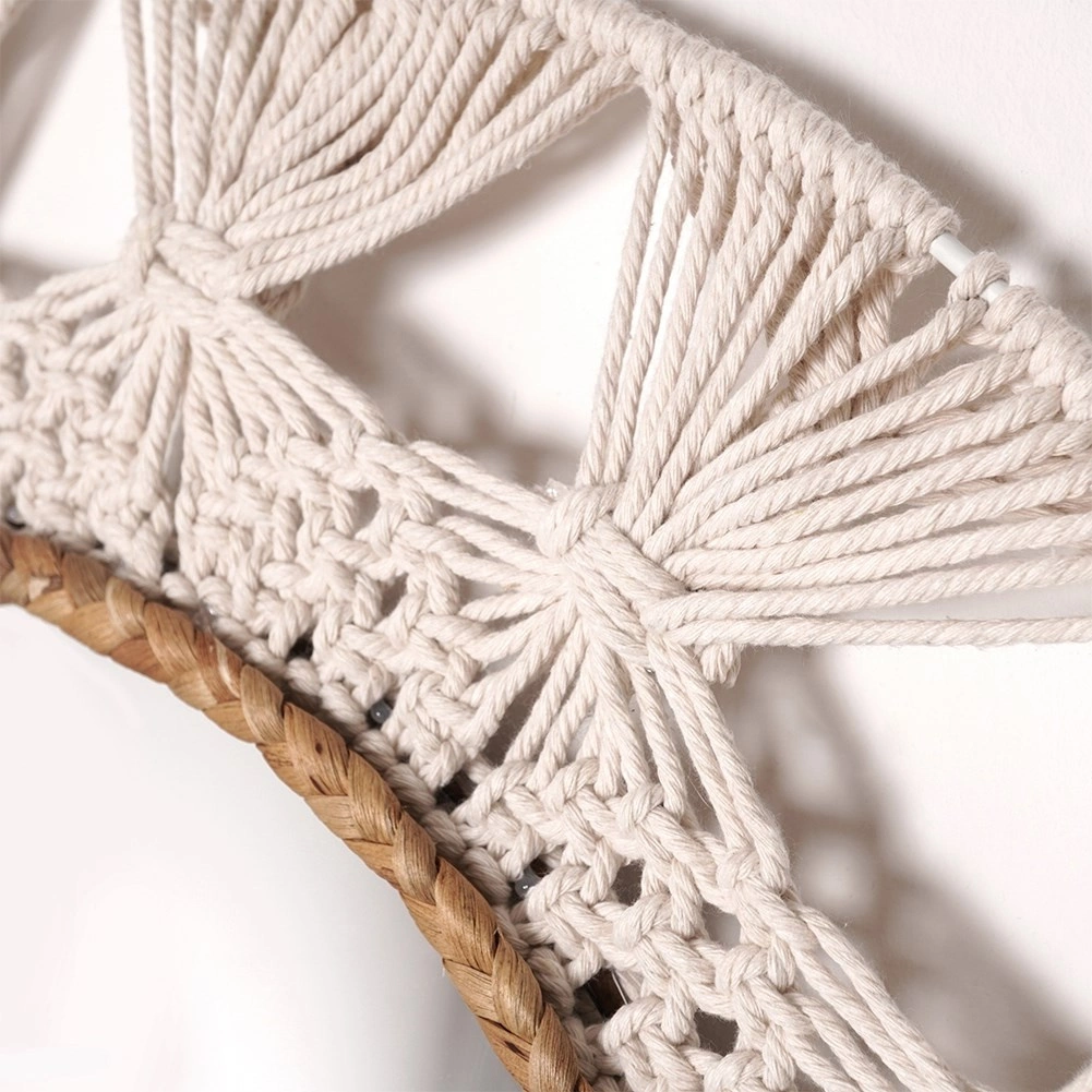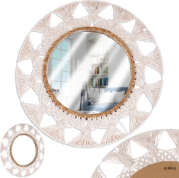 Stílusos, kerek falitükör 55 cm átmérővel, dekoratív makramé kerettel pamutzsinórból és tengeri fűből, amely boho hangulatot kölcsönöz a belső térnek, optikailag világosít és tágítja a teret, valamint a minőségi üvegfelületnek köszönhetően tiszta és éles tükröződést biztosít.