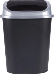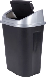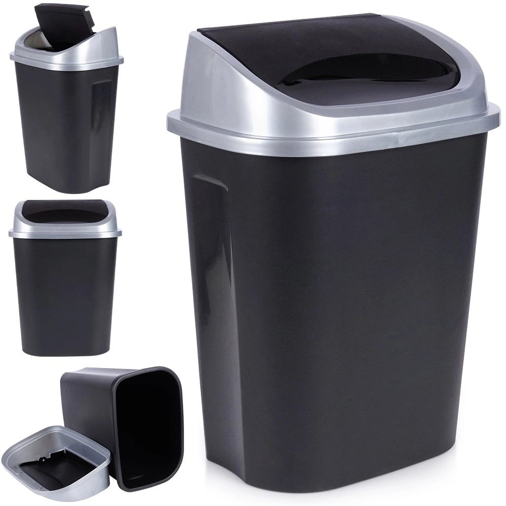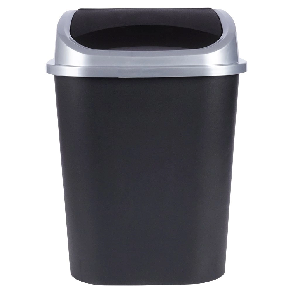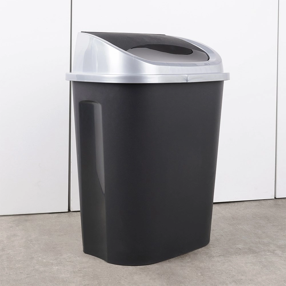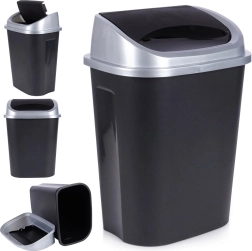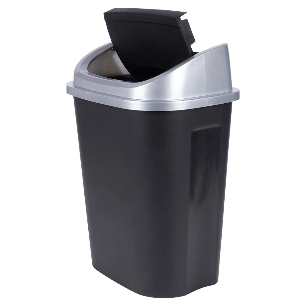 Praktikus szemetes matt fekete testtel és ezüst szegélyű fedéllel, amely remekül illik otthonokba és irodákba. A billenő fedél megkönnyíti a tiszta hulladékbedobást, míg a levehető felső rész egyszerűvé teszi a zsákcserét és a tisztítást. Kompakt méreteinek köszönhetően a padlóra állítható vagy szekrényben elrejthető.