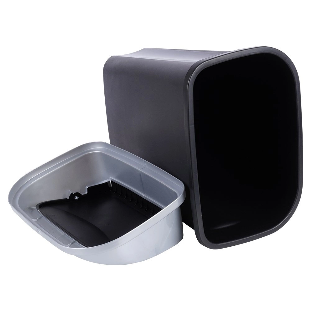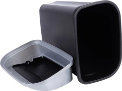 A matt fekete, ezüstszegélyes erős műanyag egyszerre strapabíró és könnyű. Az integrált oldalsó fogantyúk megkönnyítik a kezelést és az ürítést.
