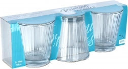 Fedezze fel a praktikus és időtálló, 3 darabos, 220 ml-es pohárszettet, amely kiválóan alkalmas vízhez, limonádékhoz, gyümölcslevekhez, jeges teákhoz és kevert italokhoz. Az átlátszó üveg függőleges bordázata kiemeli az ital színét, és magabiztosabb fogást biztosít.