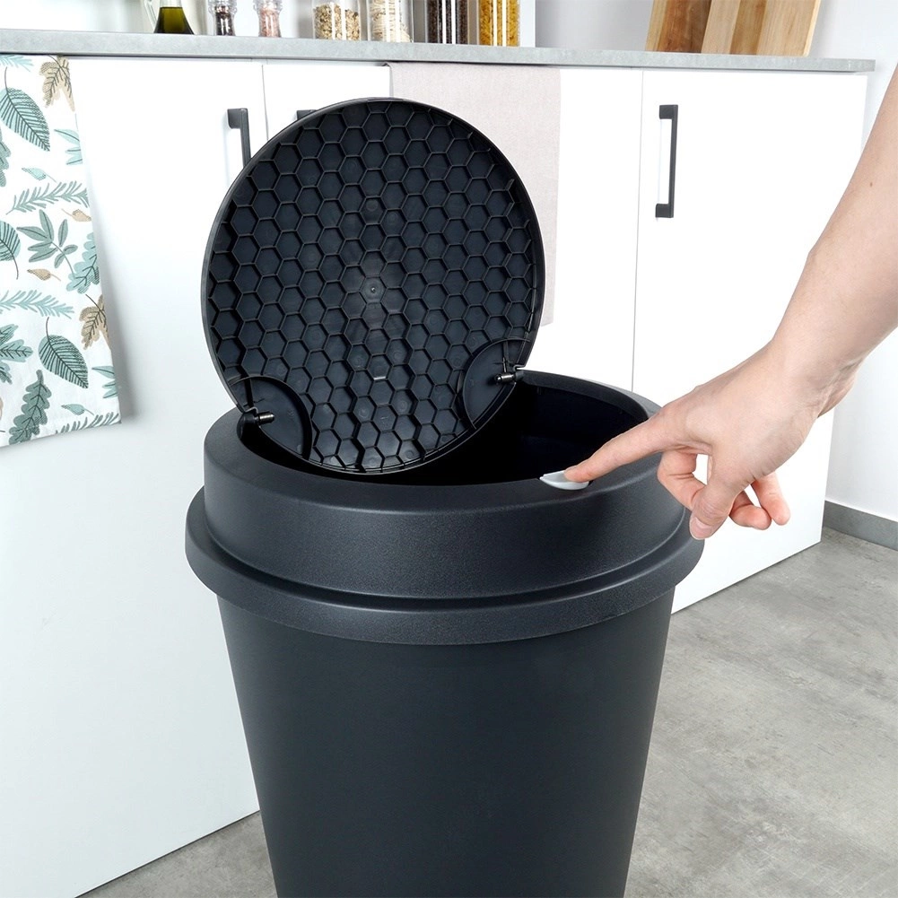 Ez a fekete, 47 literes szemetes a mindennapi kényelemre és tisztaságra készült. Kétlépcsős fedéllel rendelkezik a gyors, billentős bedobáshoz, illetve gombnyomásos nyitással, amely segít csökkenteni a szagterjedést. Időtálló megjelenése jól illik modern és klasszikus enteriőrökhöz is.