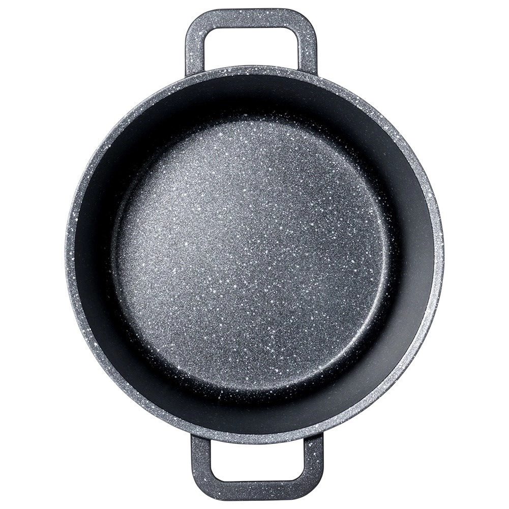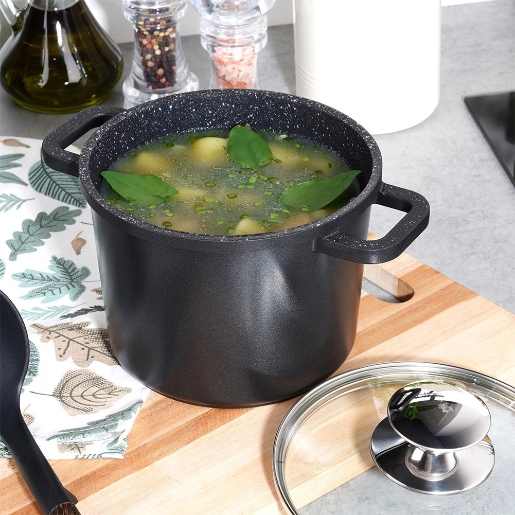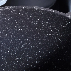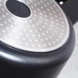 Elegáns, fekete alumíniumból készült lábas belső, PFLUON gránit tapadásmentes bevonattal, amely megakadályozza az étel leégését, megkönnyíti a tisztítást, és megőrzi a természetes ízeket és tápanyagokat. Az üvegfedő gőzkieresztő nyílással lehetővé teszi a főzés felügyeletét felesleges fedőemelgetés nélkül.
