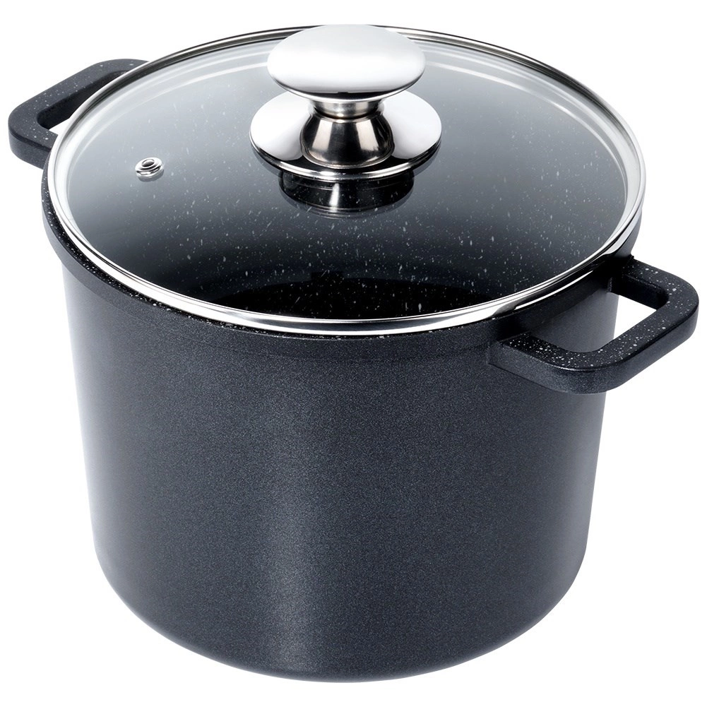 A GRANDE magas lábas tartós alumíniumból készült, belső tapadásmentes PFLUON gránitbevonattal, amely nem tartalmaz PFOA-t és PTFE-t. Ennek köszönhetően egészségesebb ételeket készíthet kevesebb zsiradékkal, leégés nélkül. Az üvegfedő rozsdamentes acél peremmel és szellőzőnyílással lehetővé teszi a főzés ellenőrzését felesleges fedőemelgetés nélkül.