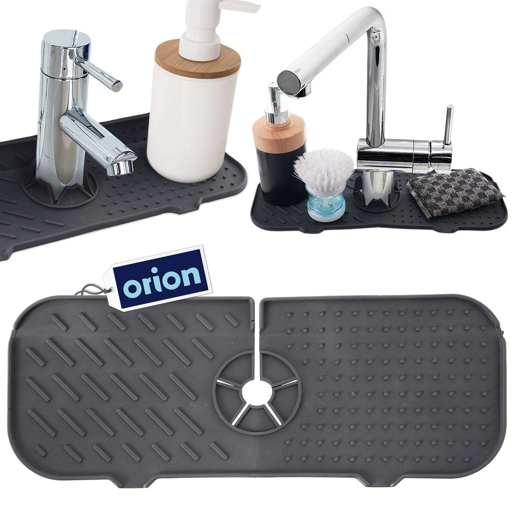 Praktikus, 36 × 14 cm méretű szilikon alátét a mosogatóhoz, amely szárazon tartja a csap környékét és a munkalapot. A középső kivágásnak köszönhetően a legtöbb csaptelephez illeszkedik, csepegtetőtálcaként szolgál szivacsokhoz és mosogatószerekhez, és megóvja a felületet a nedvességtől és a vízkőtől. Tartós szilikonból készült, könnyen tisztítható és mosogatógépben mosható. Csúszásmentes felület, gyors vízelvezetés és hosszú élettartam.