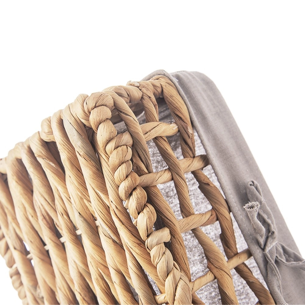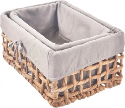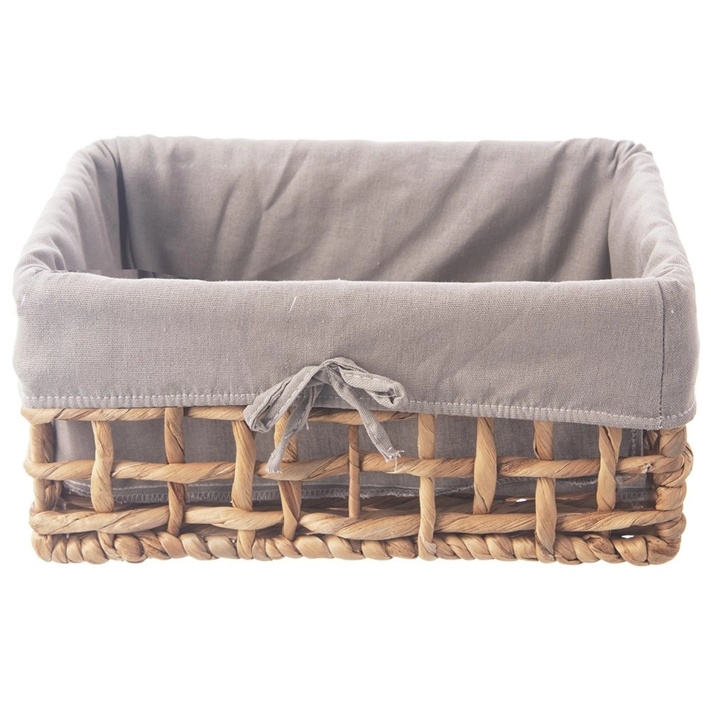 Ez a praktikus és dekoratív kosár természetes anyagból (vízi jácint) készül, masszív fémvázzal, így megőrzi formáját és hosszú élettartamú. A puha, elegáns szürke textilbetét védi az elhelyezett tárgyakat, könnyen kivehető és 30 °C-ig mosható.