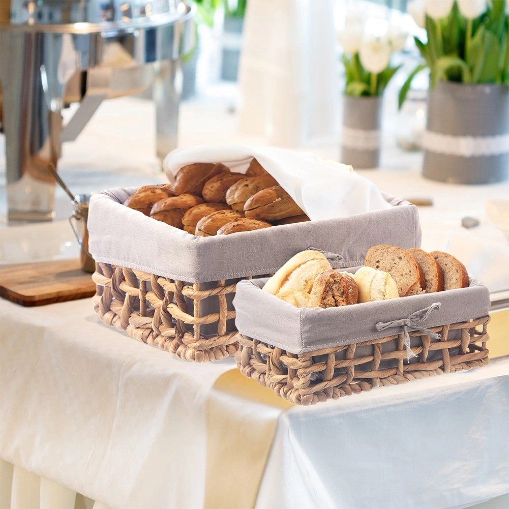 Stílusos tároló kosár természetes rostokból, kézi fonással és kivehető, mosható betéttel szürke színben. Ideális a háztartás rendszerezéséhez, a fürdőszobába, hálószobába és gardróbba, valamint pékáru tálalására otthon és vendéglátásban is.