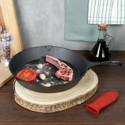Ez a fekete, teljes egészében öntöttvas serpenyő ideális sütéshez, pároláshoz és pirításhoz. Az öntöttvas egyenletesen melegszik fel és hosszan tartja a magas hőmérsékletet, így a steak, a zöldség és a burgonya tökéletes állagot kap, és tovább marad meleg. A piros szilikon védő biztosítja a biztonságos fogást égési kockázat nélkül.