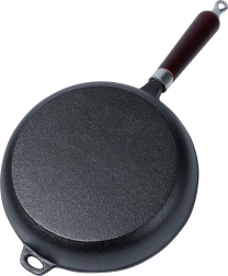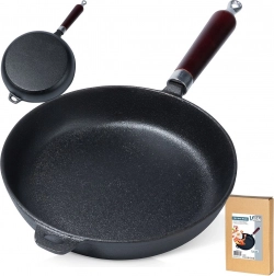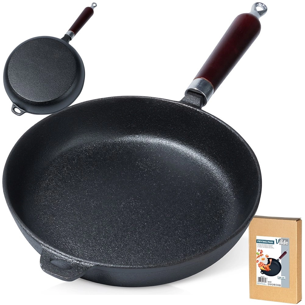 Univerzális, 24 cm átmérőjű öntöttvas serpenyő mindennapi főzéshez otthon és a szabadban. Egyenletes hőeloszlás, hosszú hőtartás, magas hőmérséklettel szembeni ellenállás és ergonomikus fa nyél teszi megbízható segítőtárssá sütéshez, pároláshoz és sütőben sütéshez tűzhelyen, grillen és sütőben is.
