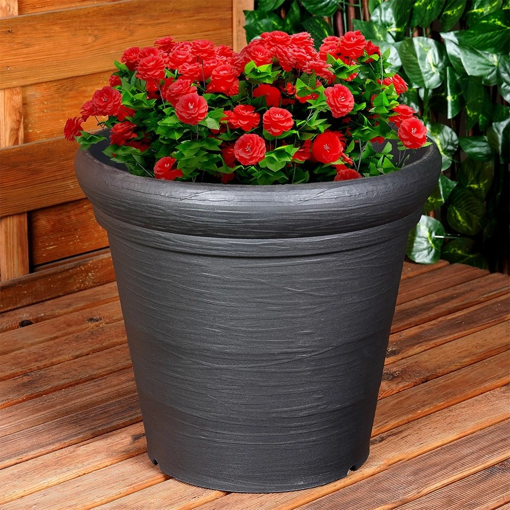 A strapabíró műanyagnak köszönhetően ellenáll az esőnek, szélnek és az UV-sugárzásnak, így egész évben alkalmas kültéri elhelyezésre. A finom körbefutó domborítás dekoratív hatást biztosít, a cserép pedig könnyen tisztítható például kerti slaggal.