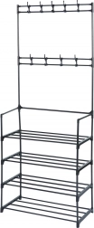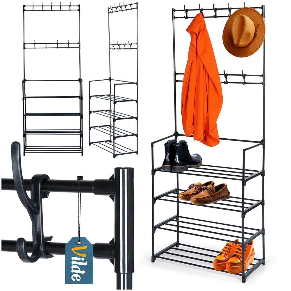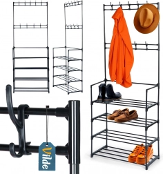 Praktikus álló ruhafogas integrált cipőtartó polccal, amely helytakarékosságot és elegáns, loft stílusú ipari megjelenést kombinál. 9 akasztó ruhák és kiegészítők számára, valamint 4 tágas polc cipőknek, táskáknak vagy tárolódobozoknak. A tartós fekete fém szerkezet stabilitást és hosszú élettartamot biztosít, a kompakt 57 × 28 × 156 cm méret pedig kiválóan illik előszobába, gardróbba, irodába vagy váróhelyiségbe.